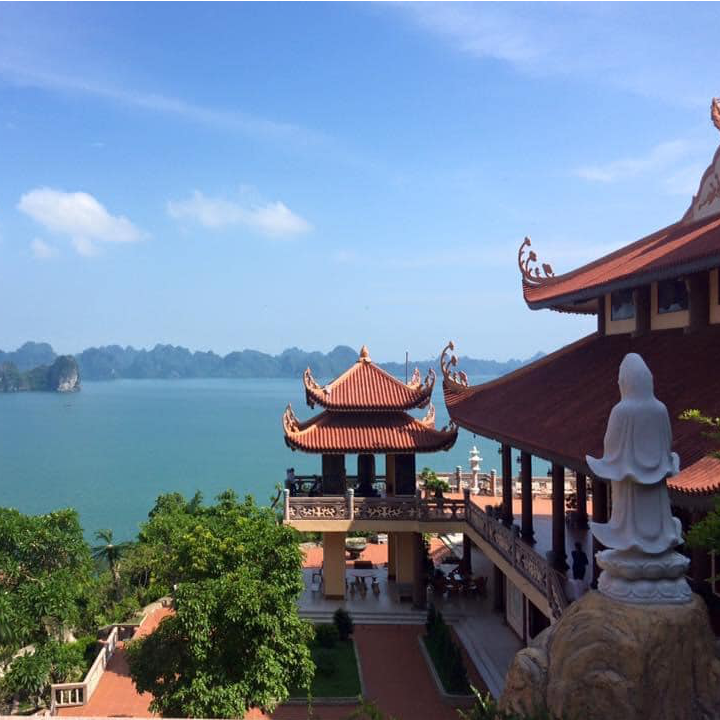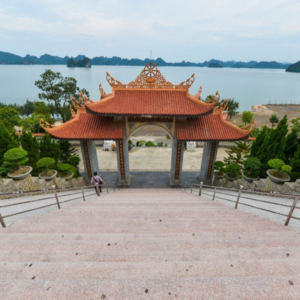 🌊 Ngôi chùa độc đáo với vị trí tuyệt đẹp – tọa lạc trên một ngọn đồi cao, hướng thẳng ra vịnh Bái Tử Long, tạo nên một khung cảnh hùng vĩ và thơ mộng.